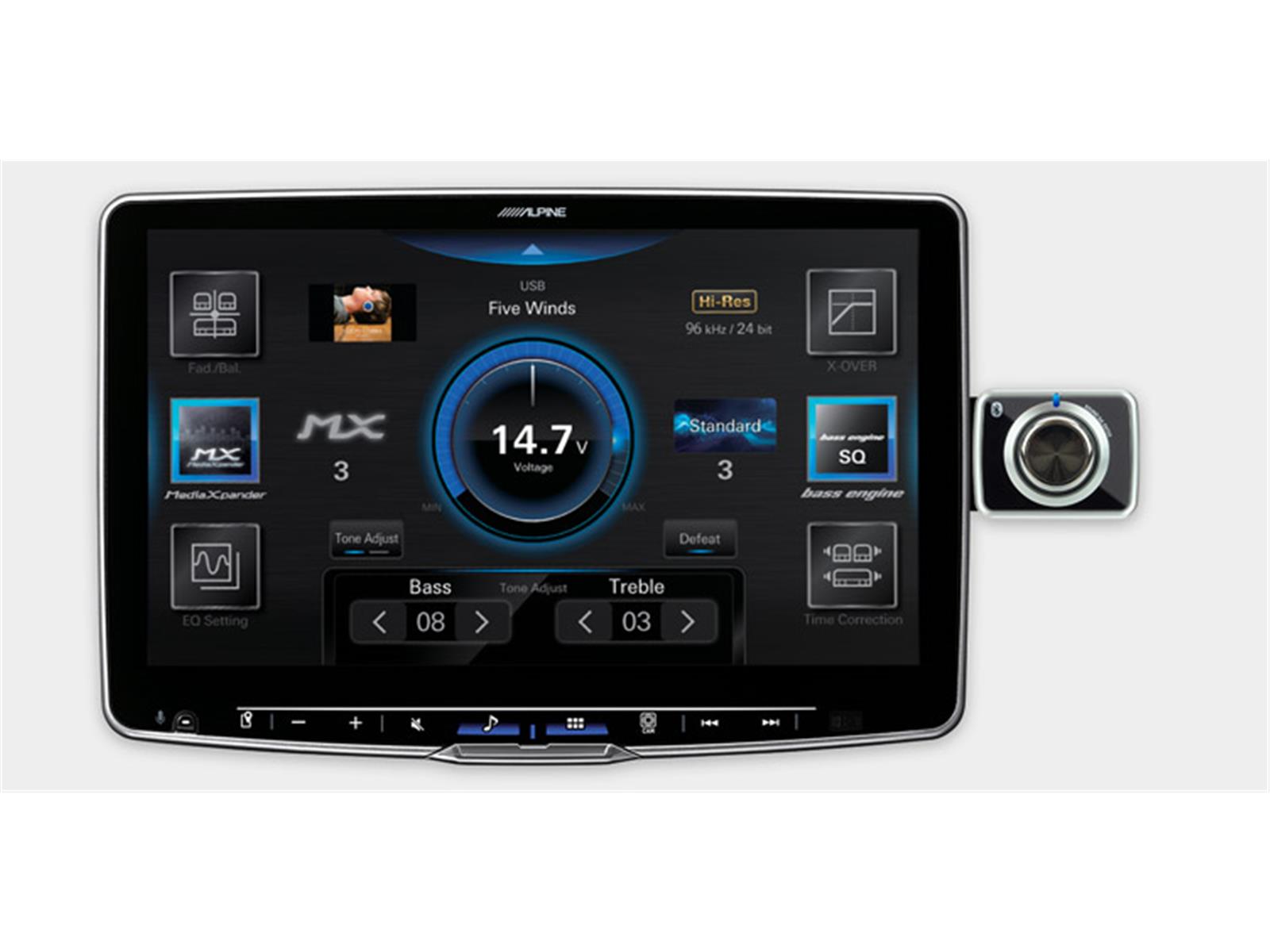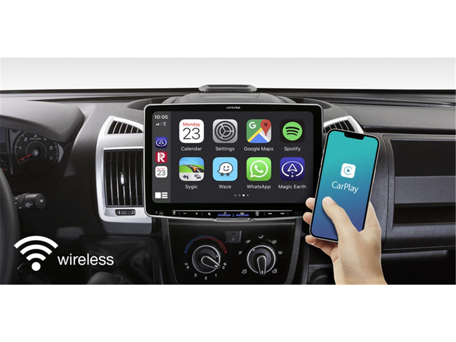 Das Display schwebt optisch über dem Armaturenbrett, ist in Höhe, Tiefe und Neigung verstellbar und bietet 49 % mehr Fläche als das Alpine Halo9. Dank Wireless Apple CarPlay und Android Auto (kabelgebunden) nutzen Sie Navigation, Musik-Streaming oder Telefonie bequem direkt vom Smartphone.