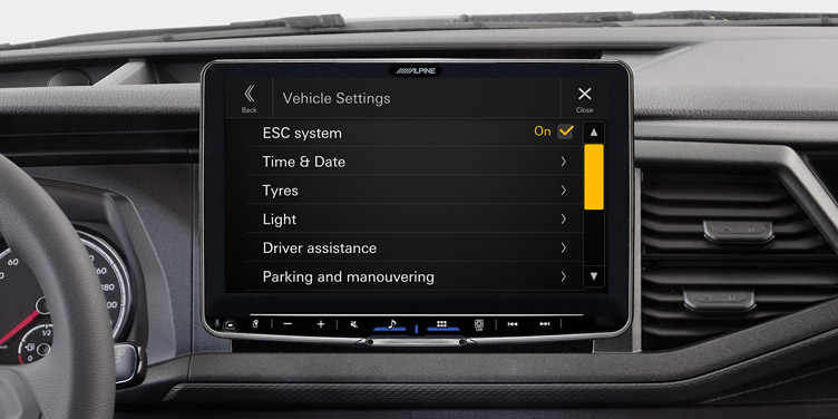 Das Set wird mit allen notwendigen Einbauteilen für den T6.1 geliefert. Das CAN-Bus-Interface überträgt die Lenkrad-Fernbedienungssignale (inkl. SIRI- und OK-Google-Unterstützung) und verbindet die Multifunktionsanzeige (MFA) im Kombiinstrument – Sendername, Songtitel, Interpreteninfo und Anruferkennung werden dort angezeigt. Fahrzeugeinstellungen (Klima/HVAC, Parksensoren/OPS) sind direkt über den Alpine-Touchscreen erreichbar. Originale Rückfahrkamera und Werks-Freisprechmikrofon werden vollständig übernommen.
