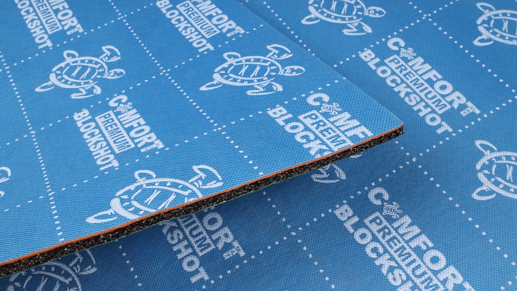Comfort Mat BLOCKSHOT 8mm – mehrschichtiger Schallisolator, bis –30 dB Reduzierung. 5,14 kg/m². 1 Platte – 500×700 mm. 2. Schicht. Farbe: Blau.