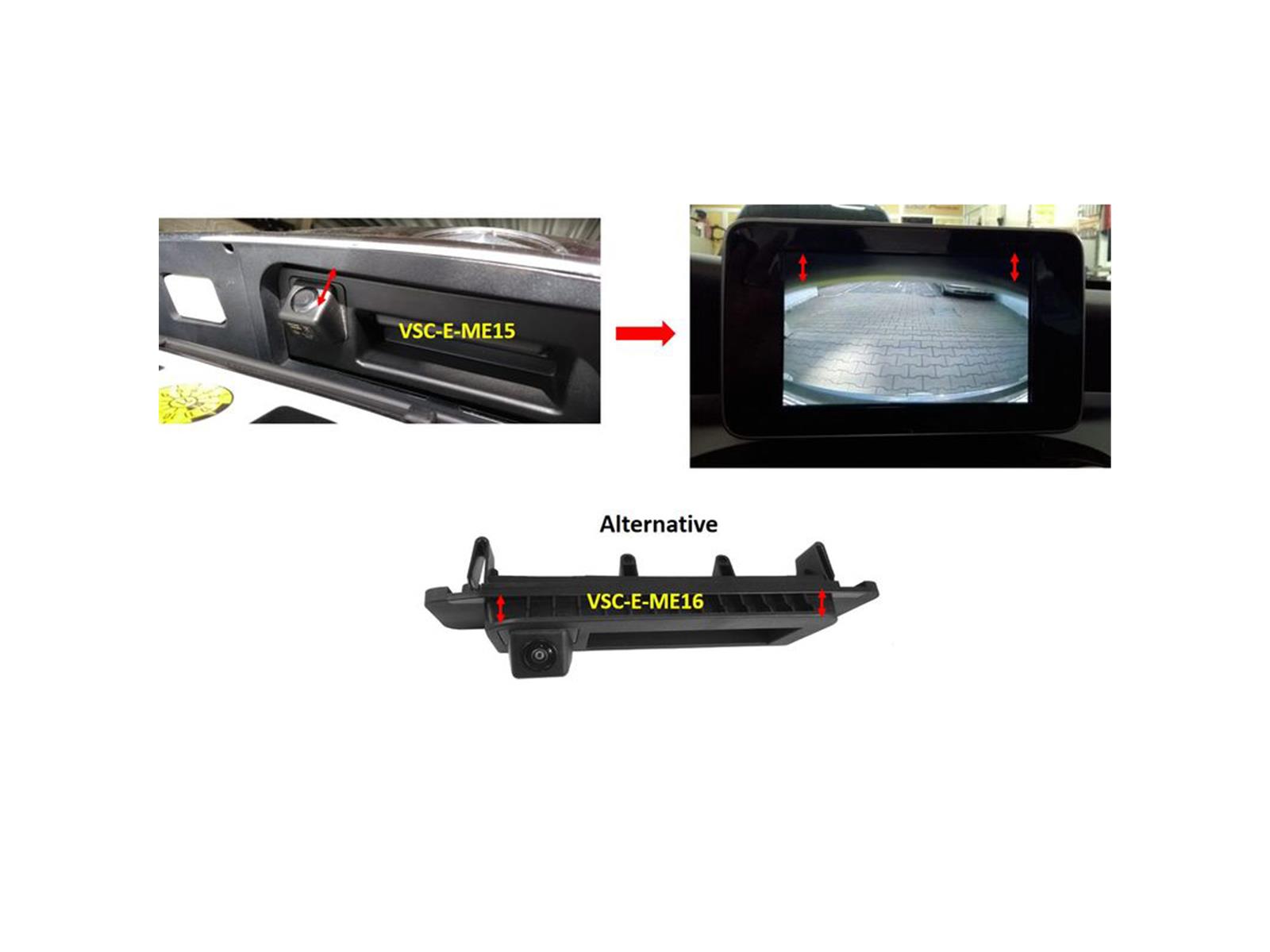 Dieses Komplettset besteht aus dem Ampire Kamera Interface V5-NTG5-PNP sowie der fahrzeugspezifischen Griffleisten-Kamera VSC-E-ME16. Die Integration erfolgt vollständig Plug & Play – ohne Codierung oder Softwareeingriff.