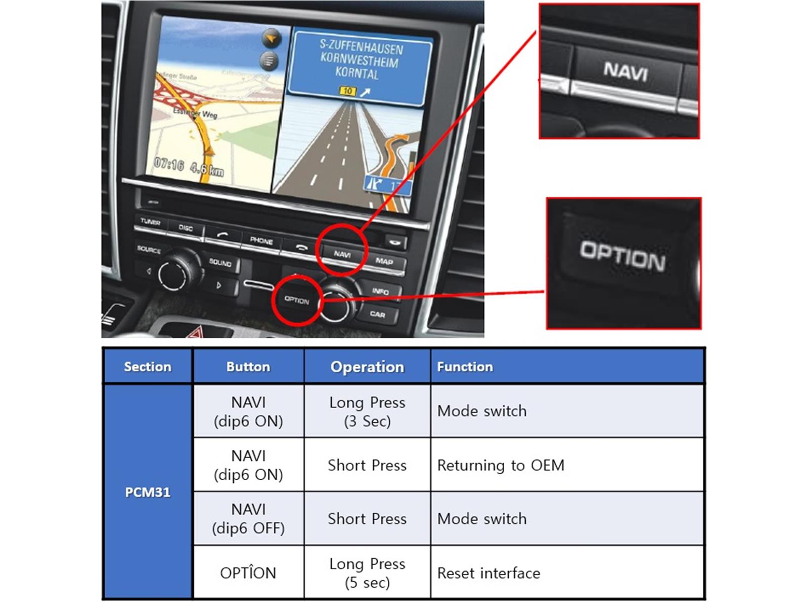 Ist am Gerät eine NAVI-Taste vorhanden, handelt es sich nicht um ein CDR31, sondern um ein PCM-System. In diesem Fall ist dieses Interface nicht geeignet.