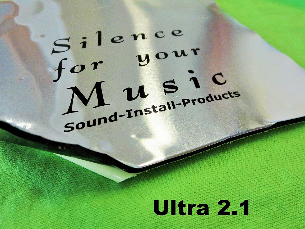 ULTRA 2.1 von sound-install-products – sehr steifes Premium-Alubutyl, hitzebeständig bis 100°C. Verlustfaktor 0,40, Haftung >15 N/cm. 1 Platte – 330×500 mm. Farbe: Silber.